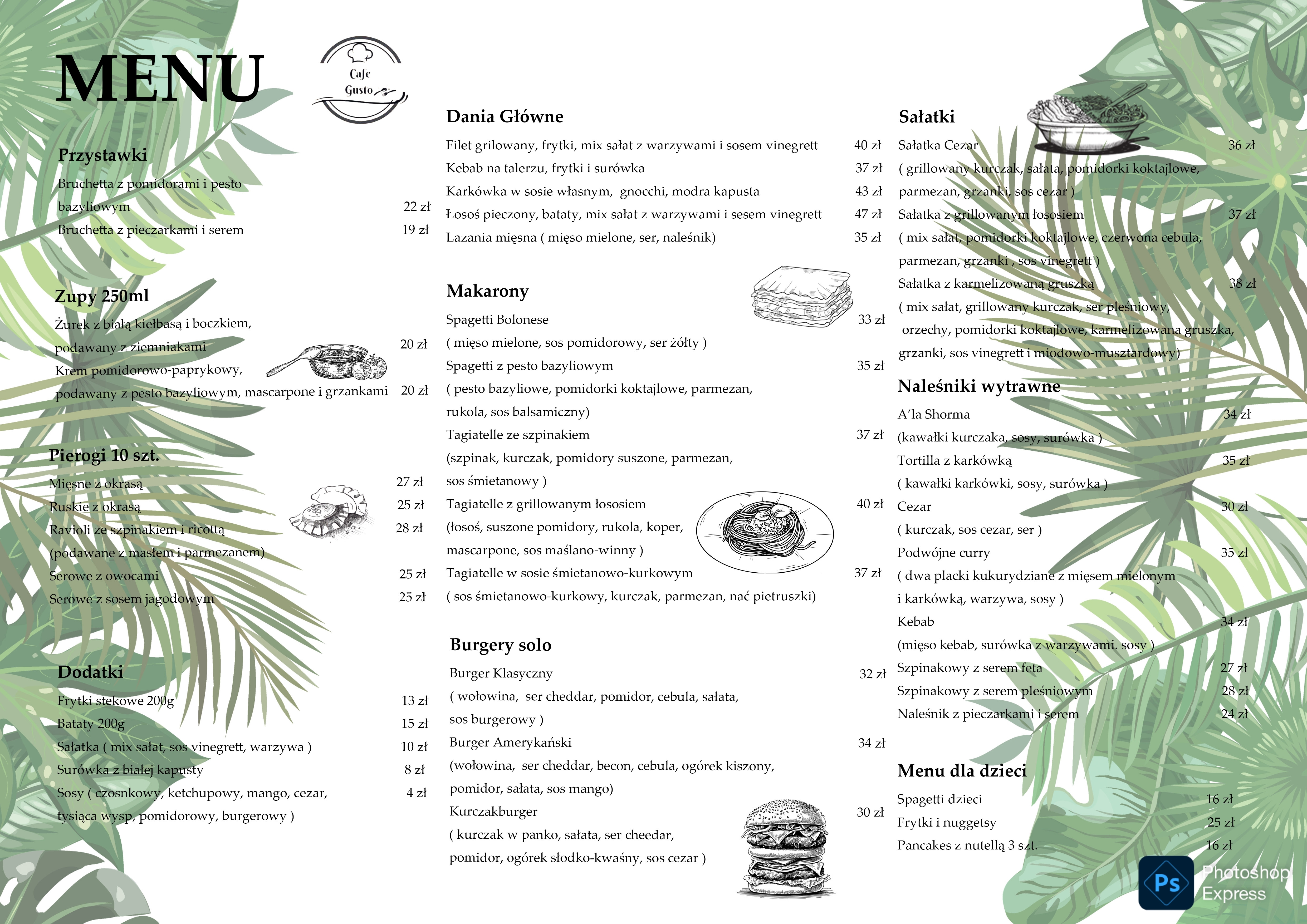 Zarezerwuj onlineCafe Gusto to restauracja ,gdzie każdy znajdzie coś dla siebie. Nasza restauracja to ucieleśnienie polskiej gościnności, oferujące szerokie menu. Znajdziecie u nas ręcznie lepione pierogi, które cieszą się wielką popularnością. Oferujemy także kuchnię włoską i amerykańską :) Serwujemy pyszną kawę ,która zawsze znajdzie coś do pary -nasze przepyszne ciasto ... Każde danie jest przygotowywane z wielkim sercem , aby klient był zadowolony , to wszystko dla WAS :)